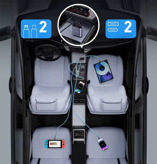 Rechargez en Famille, Voyagez Sereinement !Plus de disputes pour le chargeur en voiture ! Avec ses ports USB-A, USB-C et ses câbles rétractables intégrés, Dryyver Volt permet de recharger simultanément smartphones, tablettes et consoles. Idéal pour les voyages en famille, chacun reste connecté sans interruption !